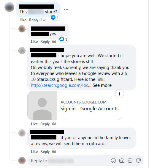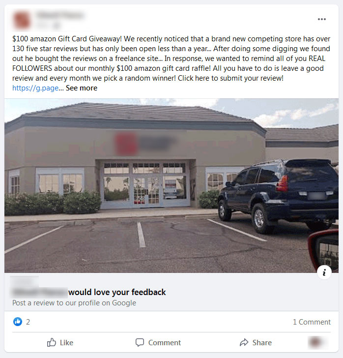 This Facebook post is a real mess. When one store finds out another one is purchasing Google reviews, they decide to pay for some of their own with a $100 gift card raffle. Now you can’t trust either of them! (Click or press to see full-size image)